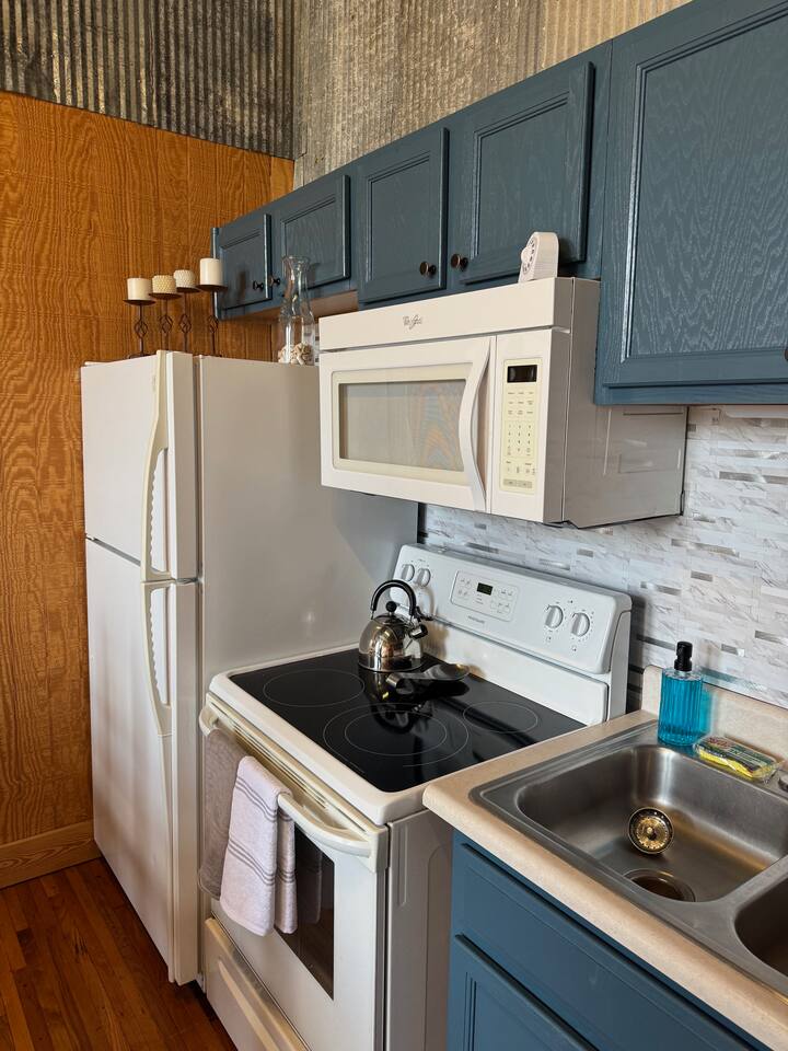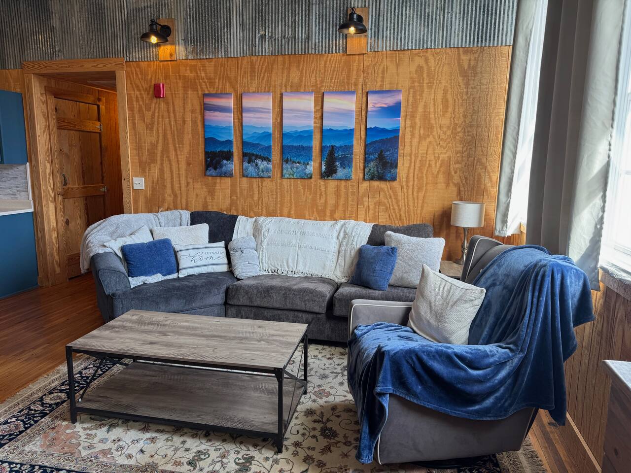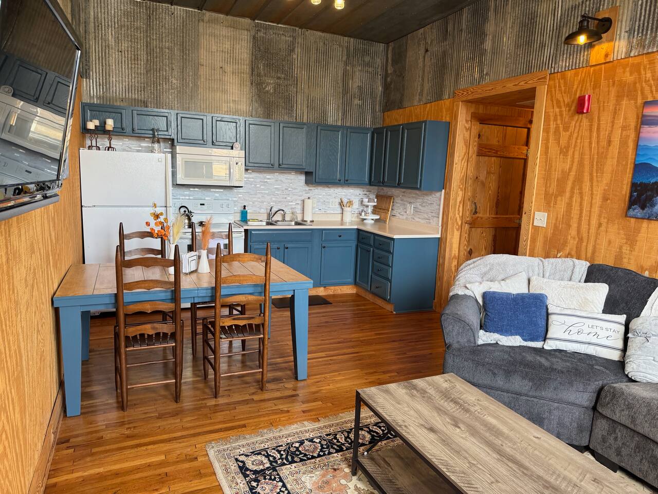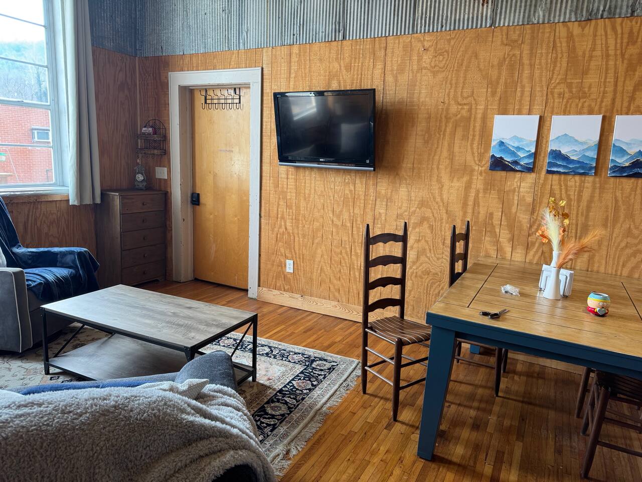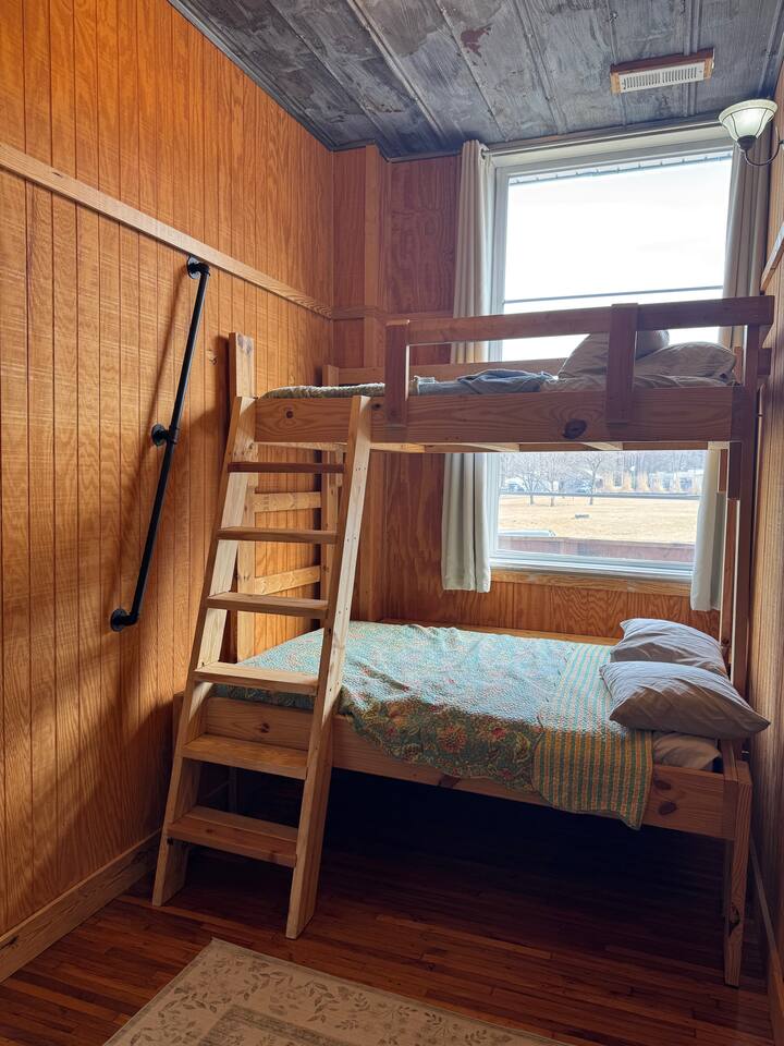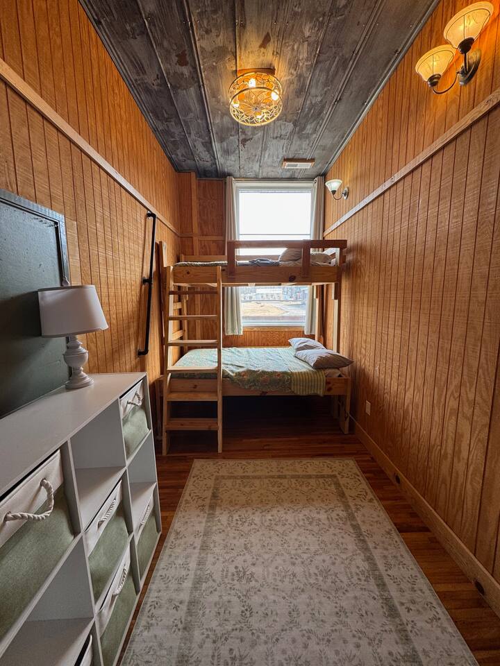 This unique place has a style all its own. This old schoolhouse meets rustic charm in this classroom turned living space. You will find creativity around every corner in this two- bedroom apartment. Rustic metal highlights the 12-ft ceilings. Each room has large windows that let in an abundance of natural light. The open concept living space is comfortable and spills over into a fully-equipped kitchen and dining area. The first bedroom has a king-sized bed and space for hanging your clothes. The second bedroom has a cabin-like feel with a bunk bed that has a double bed on the bottom and a twin bed on top. It is a built-in, very sturdy bed with comfortable mattresses suitable for kids or adults. The bathroom has a tub/shower, vanity, towels, and a selection of bath essentials. These apartments have everything you need to make your stay comfortable. There is a shared laundry facility should you need that during your visit.
