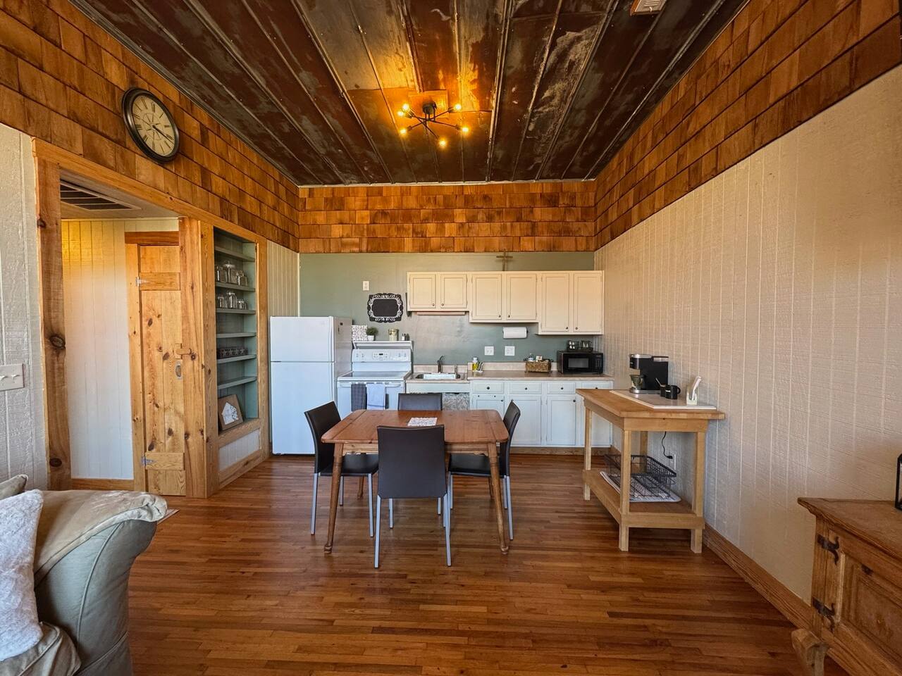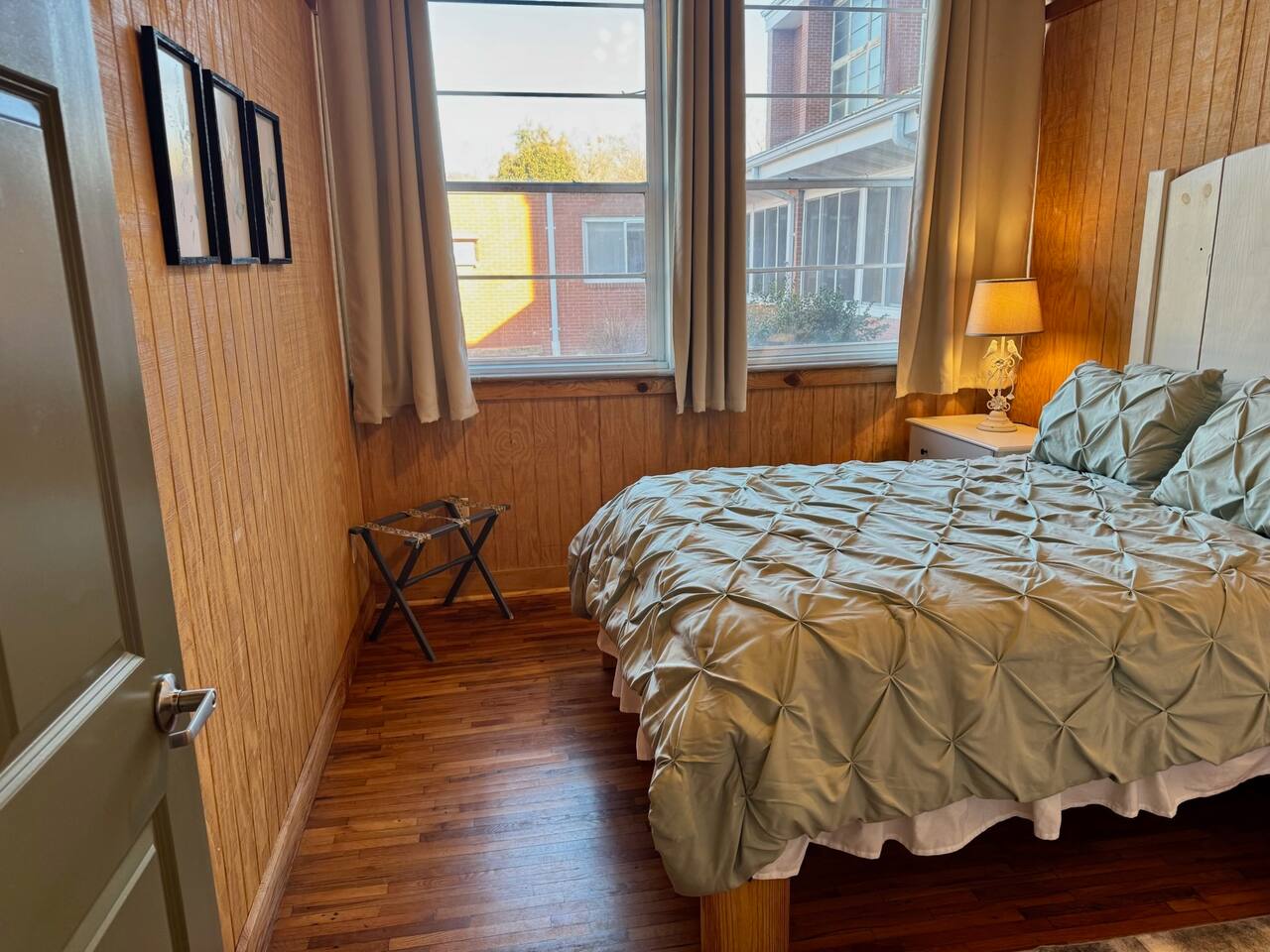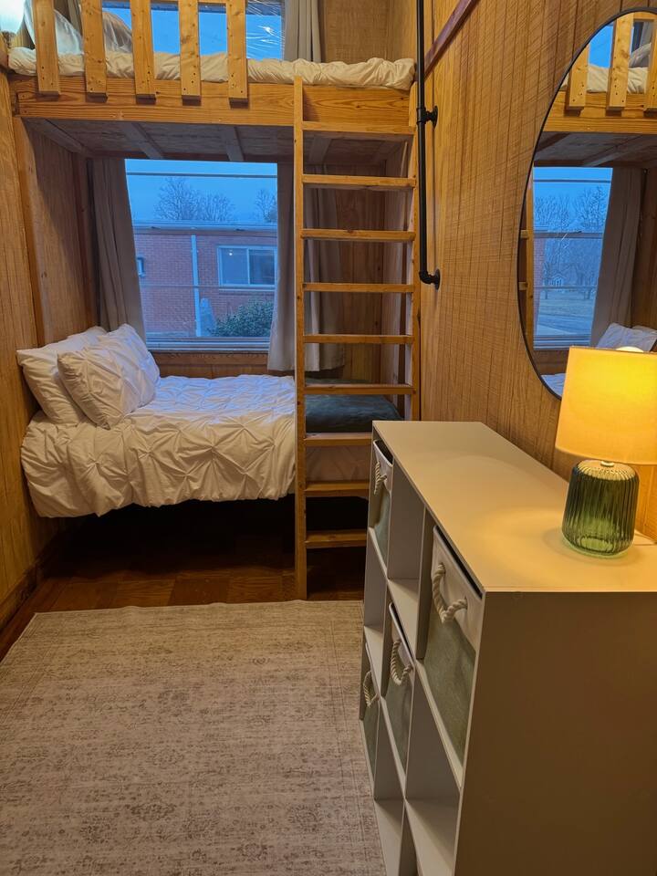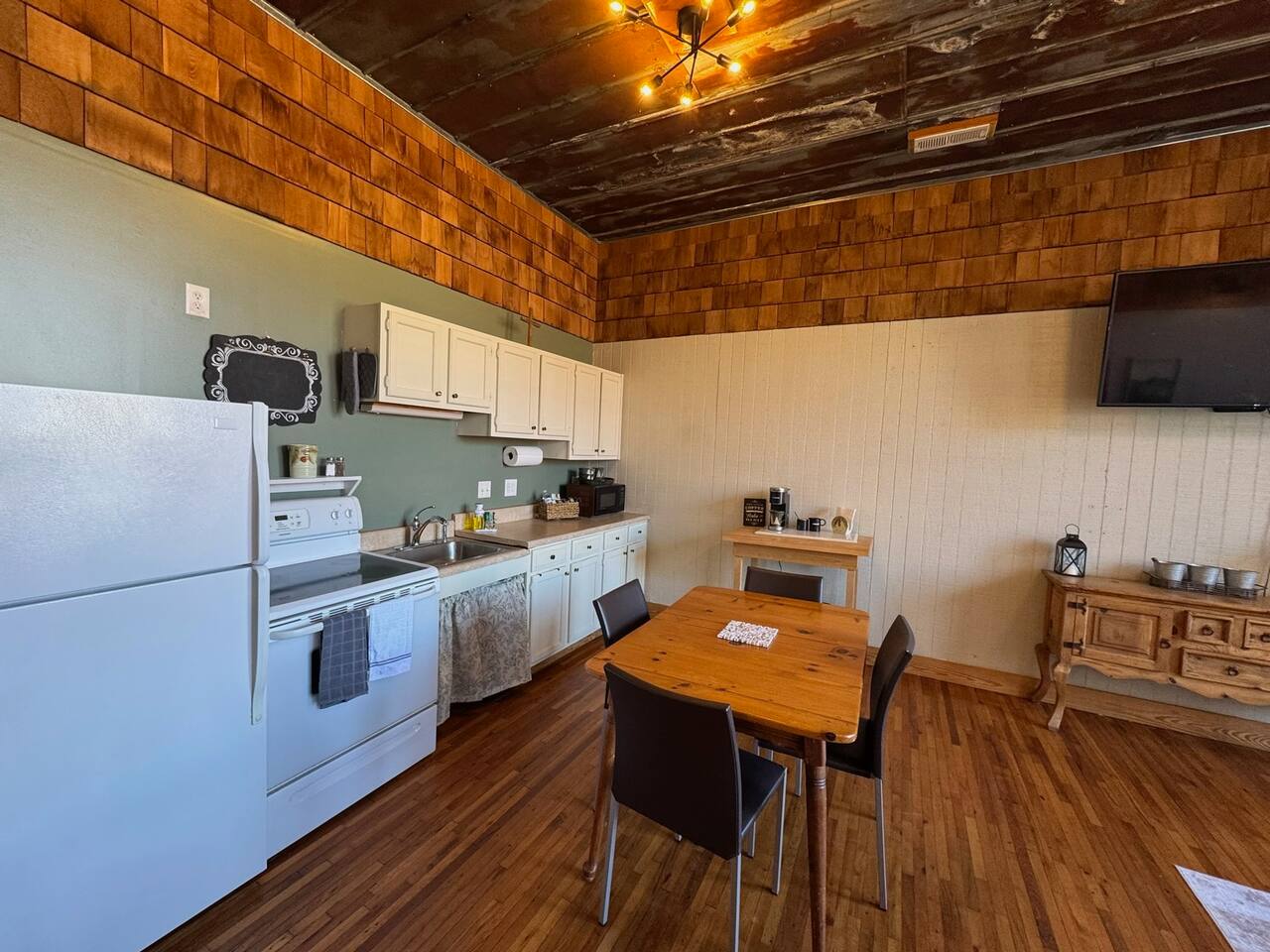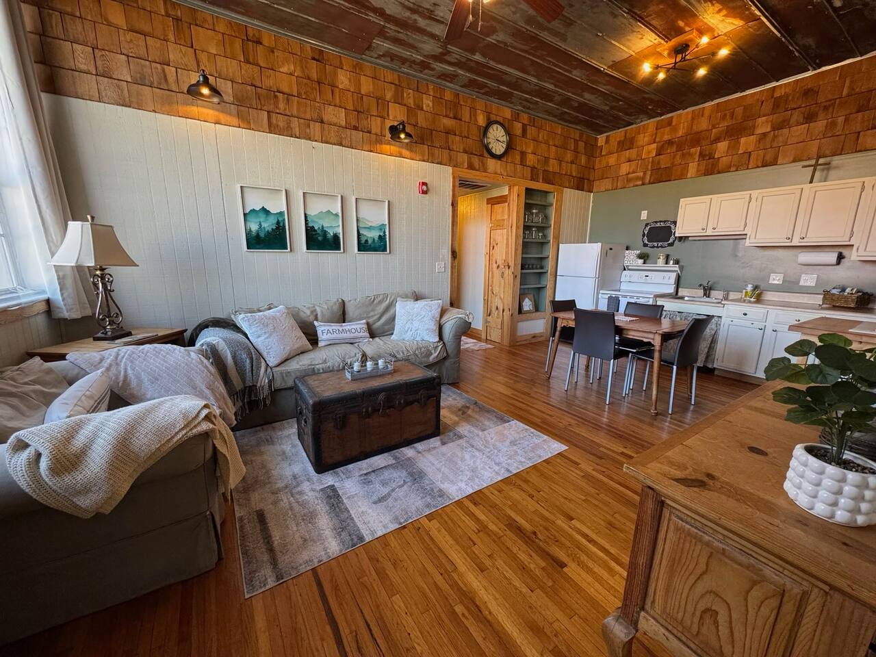 This unique place has a style all its own. This old schoolhouse meets rustic charm in this classroom turned living space. You will find creativity around every corner in this two- bedroom apartment. Rustic metal highlights the 12-ft ceilings. Each room has large windows that let in an abundance of natural light. The open concept living space is comfortable and spills over into a fully-equipped kitchen and dining area. The first bedroom has a queen-sized bed and space for hanging your clothes. The second bedroom has a cabin-like feel with a bunk bed that has a double bed on the bottom and a twin bed on top. It is a built-in, very sturdy bed with comfortable mattresses suitable for kids or adults. This apartment is ADA compliant for accessibility. The bathroom has a large stand-up / roll-in shower, vanity, towels, and a selection of bath essentials. These apartments have everything you need to make your stay comfortable. There is a shared laundry facility should you need that during your visit.