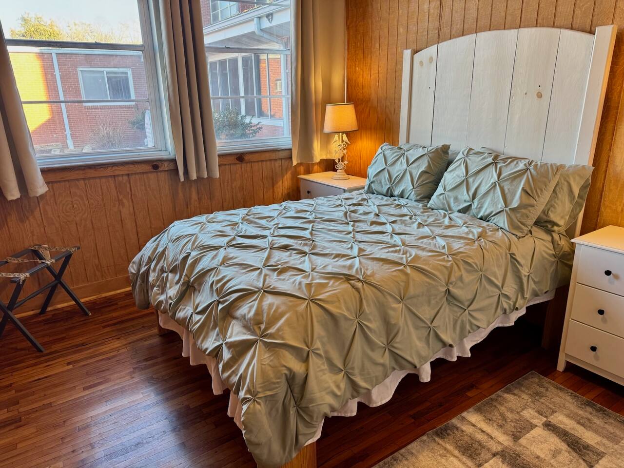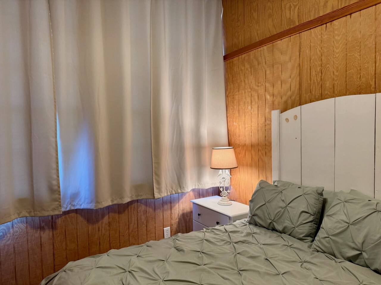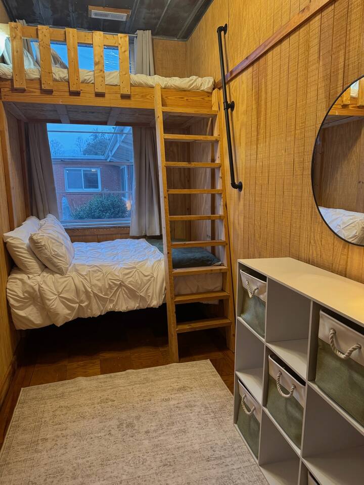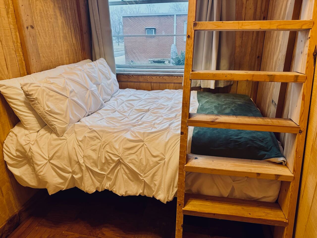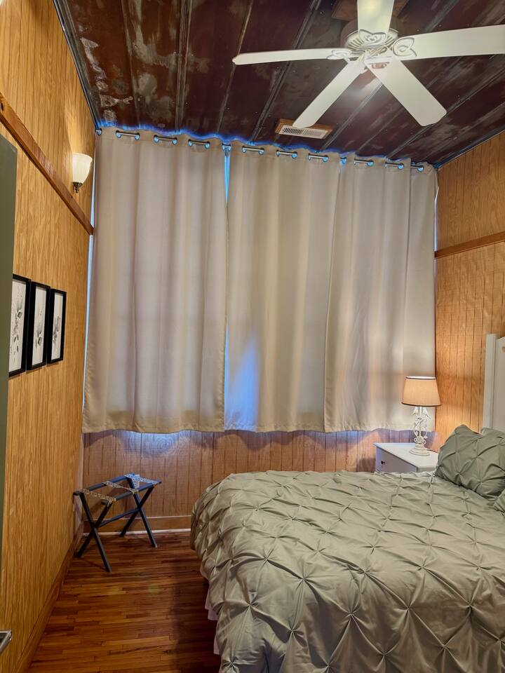 This unique place has a style all its own. This old schoolhouse meets rustic charm in this classroom turned living space. You will find creativity around every corner in this two- bedroom apartment. Rustic metal highlights the 12-ft ceilings. Each room has large windows that let in an abundance of natural light. The open concept living space is comfortable and spills over into a fully-equipped kitchen and dining area. The first bedroom has a queen-sized bed and space for hanging your clothes. The second bedroom has a cabin-like feel with a bunk bed that has a double bed on the bottom and a twin bed on top. It is a built-in, very sturdy bed with comfortable mattresses suitable for kids or adults. This apartment is ADA compliant for accessibility. The bathroom has a large stand-up / roll-in shower, vanity, towels, and a selection of bath essentials. These apartments have everything you need to make your stay comfortable. There is a shared laundry facility should you need that during your visit.